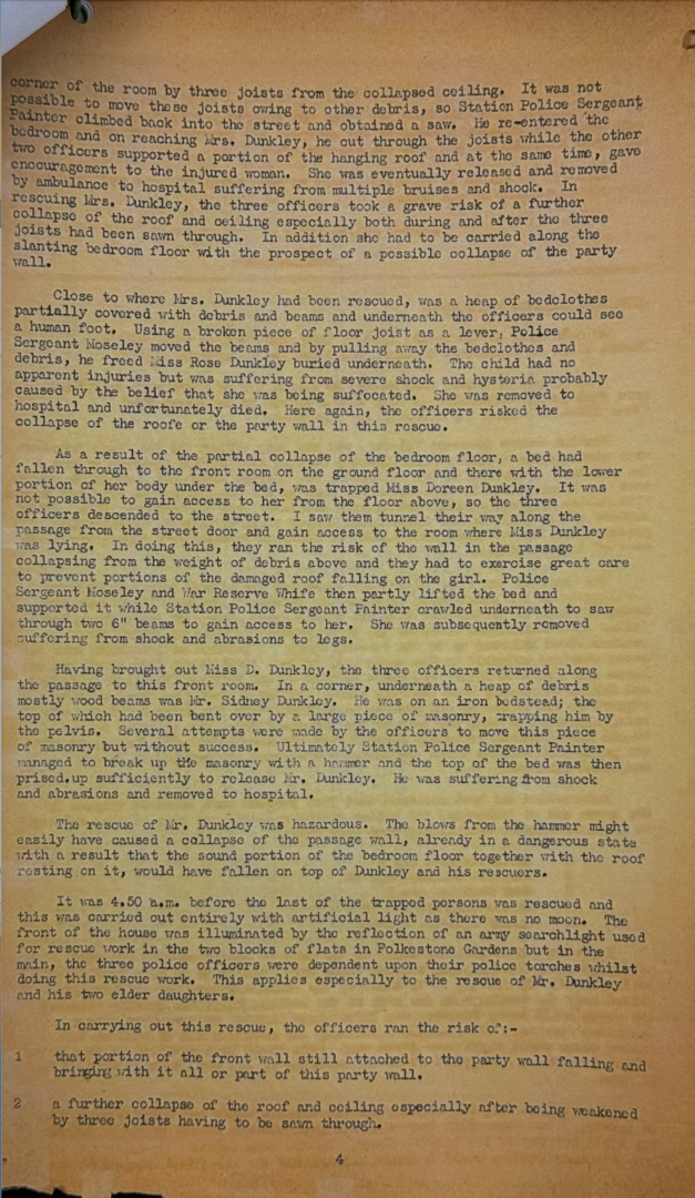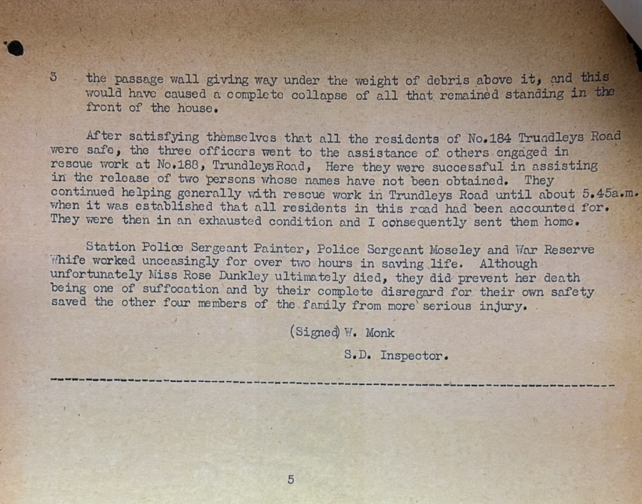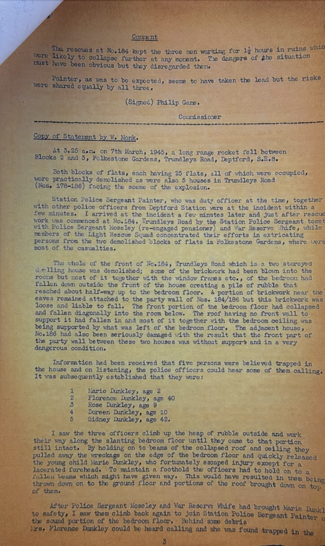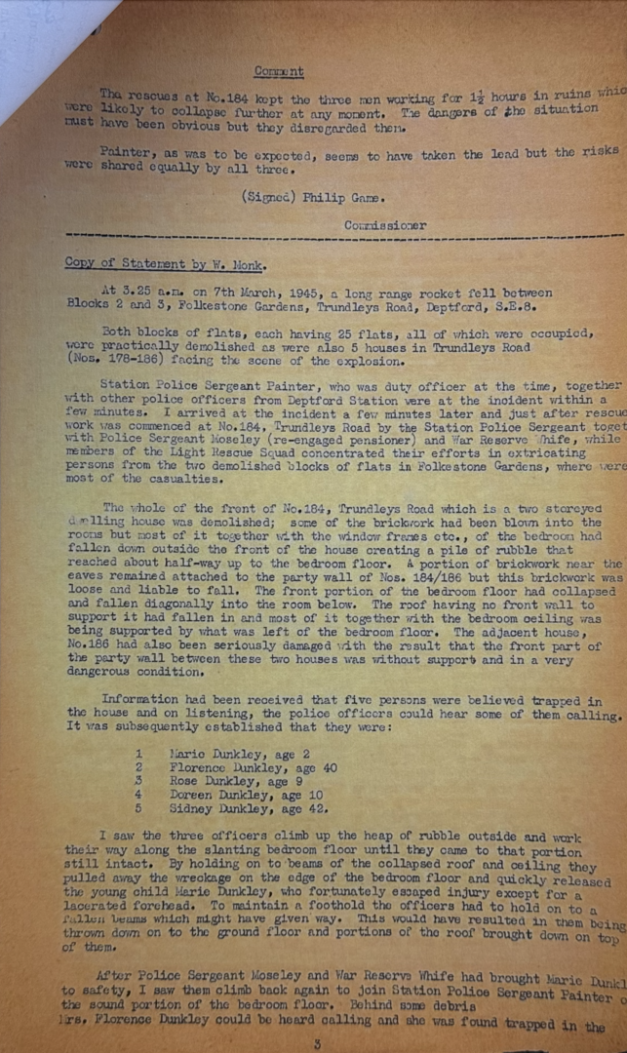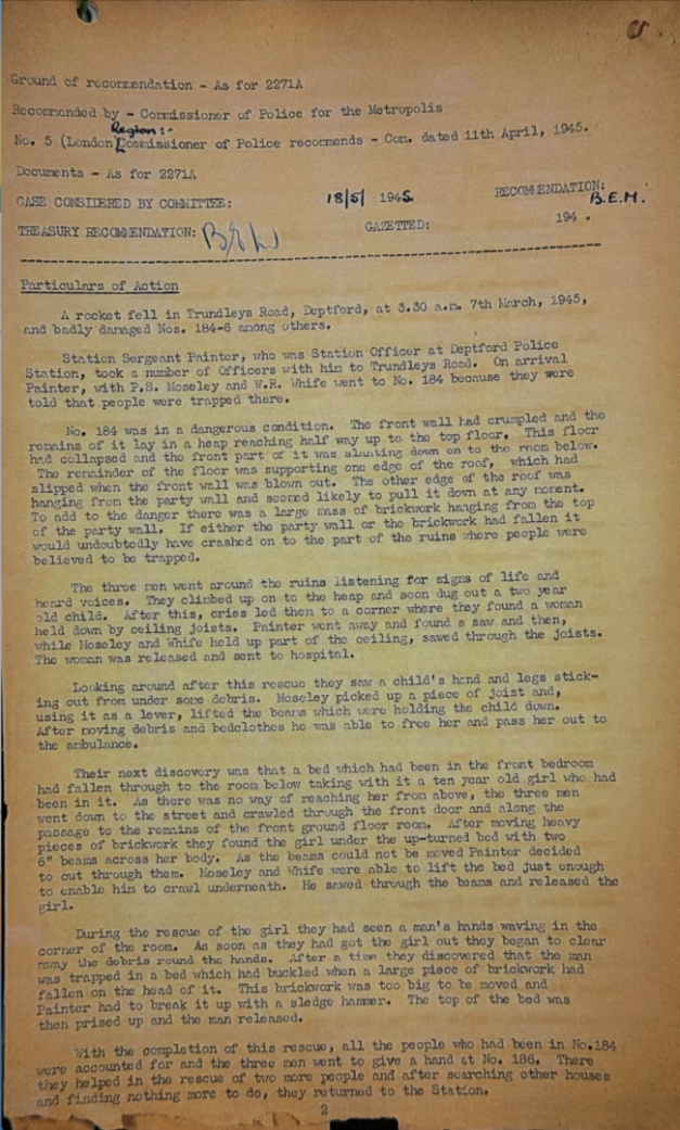 At 3.30am on 7 March 1945, he was Station Sergeant at Deptford in South London when a German V2 Rocket landed near Trundleys Road. SPS attended along with several other officers.